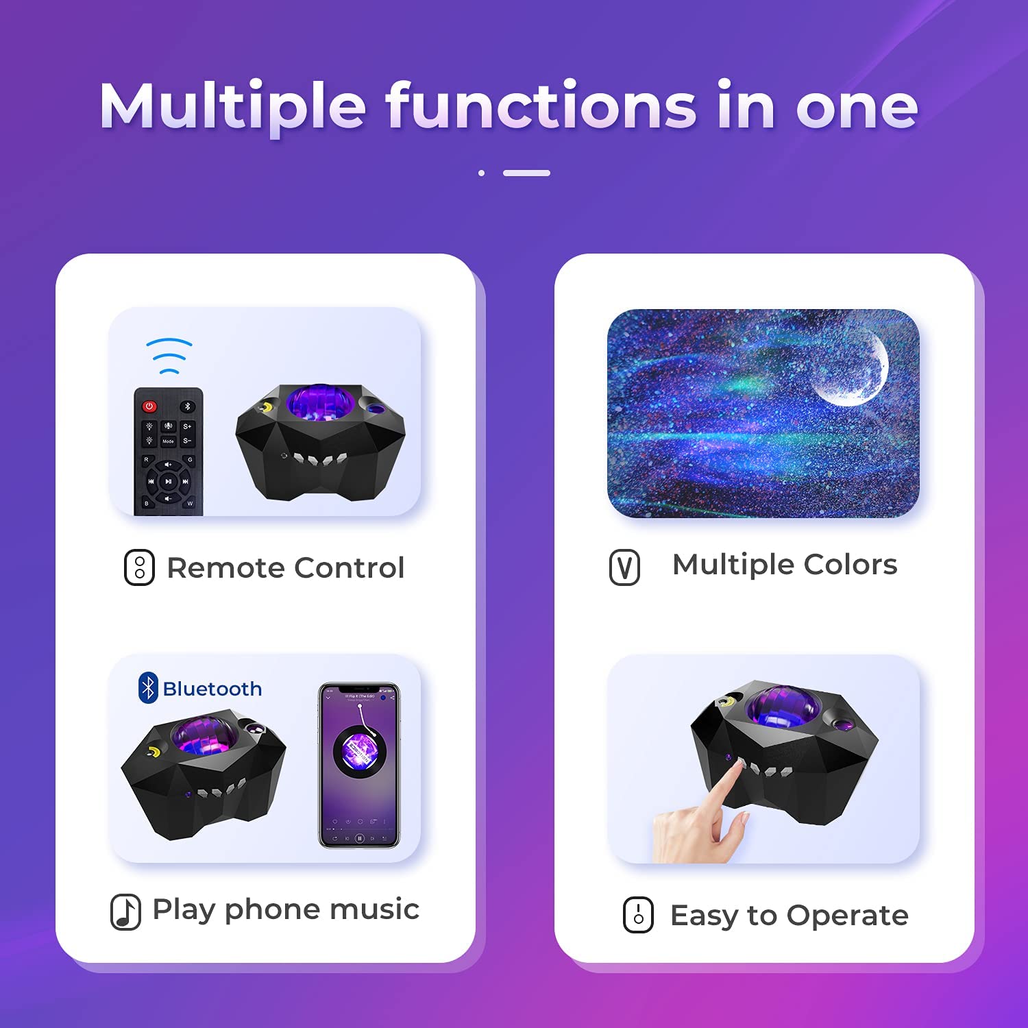 | Works with smartphones via Bluetooth,play local music through mobile phone, then you’ll see the light will change color with themusic beats.resulting in a starry sky projection.Voice Control(Only control the lights speed). | Setting 1h/2h/4h timer OFF for your sleep. | You can adjust your needs by remote control, choose the aurora wave or starry sky, moon projection mode, or choose three modes at the same time, change the color speed and brightness of the light, adjust the volume and sound mode of the music mode. |